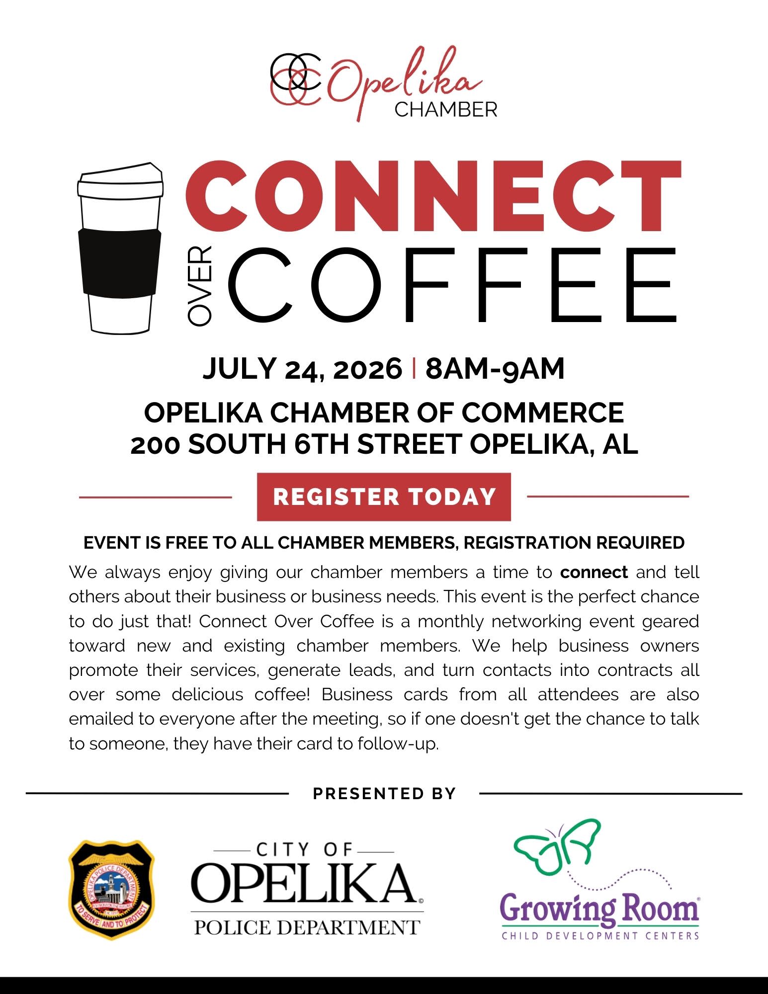 If you’re a new chamber member, don’t miss the New Member Orientation immediately following Connect Over Coffee from 9:30 AM to 10:30 AM. This session is designed to help you maximize your Chamber membership benefits and hit the ground running.